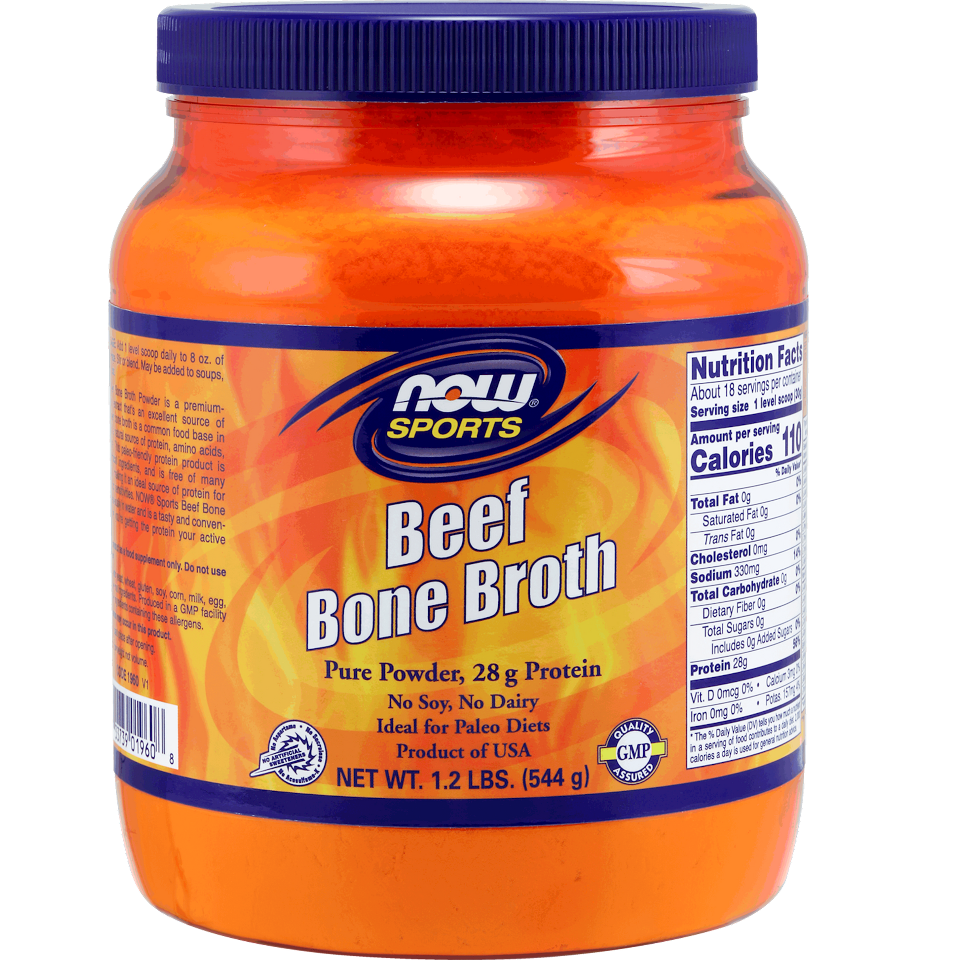 NOW Sports Beef Bone Broth Powder is a premium-quality beef bone extract thats an excellent source of natural protein. Beef bone broth is a common food base in many cultures and a natural source of protein, amino acids, collagen and more. This paleo-friendly protein product is made without artificial ingredients, and is free of many common allergens, making it an ideal source of protein for individuals with food sensitivities. NOW Sports Beef Bone Broth Powder mixes easily in water and is a tasty and convenient way to ensure youre getting the protein your active lifestyle requires. This beef bone broth powder typically has 63% naturally occurring collagen. Natural color variation may occur in this product. This product is sold by weight not volume. 28 G Protein Product of USA